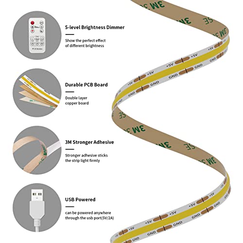 Dimbare helderheids- en geheugenfunctie: met de RF-afstandsbediening voor 5-traps helderheidsaanpassingen. Met de geheugenfunctie herstelt deze USB-gestuurde Cob-LED-strip zijn laatste installatie om tijd te besparen. PAUTIX 5V warmwitte USB-COB-ledstrips zijn ideaal voor dagelijks gebruik
