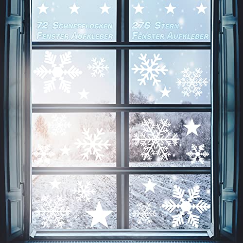 348 raamstickers voor Kerstmis: 72 stuks sneeuwvlokken raamstickers (3 designs) + 276 witte sterren (4 maten). Perfect voor kerstdecoratievensters.